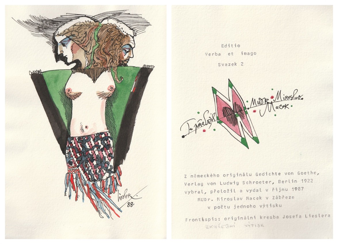 orig. kolorovaná kresba J. Liesler ve frontispisu a v tiráži, přeložil a vydal MUDr. Miroslav Macek v Zábřeze v počtu jednoho výtisku, 1987, zkušební výtisk, šité archy v obálce, ruční papír, nestr., výborný stav