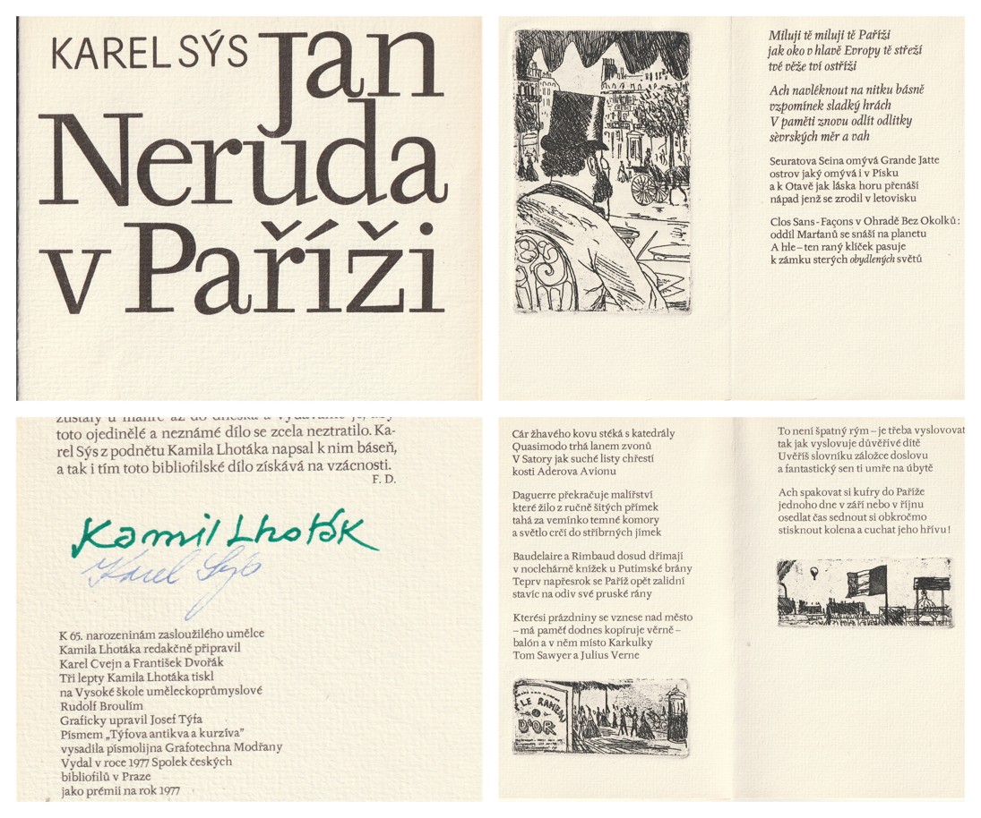 3x lept - frontispis a 2 ilustrace v textu a podpis v tiráži K. Lhoták, podpis v tiráži K. Sýs, úprava J. Týfa, doslov Fr. Dvořák, vydal Spolek českých bibliofilů, Praha 1977, volné listy v obálce, nestr. (8), ruční papír, velmi dobrý stav