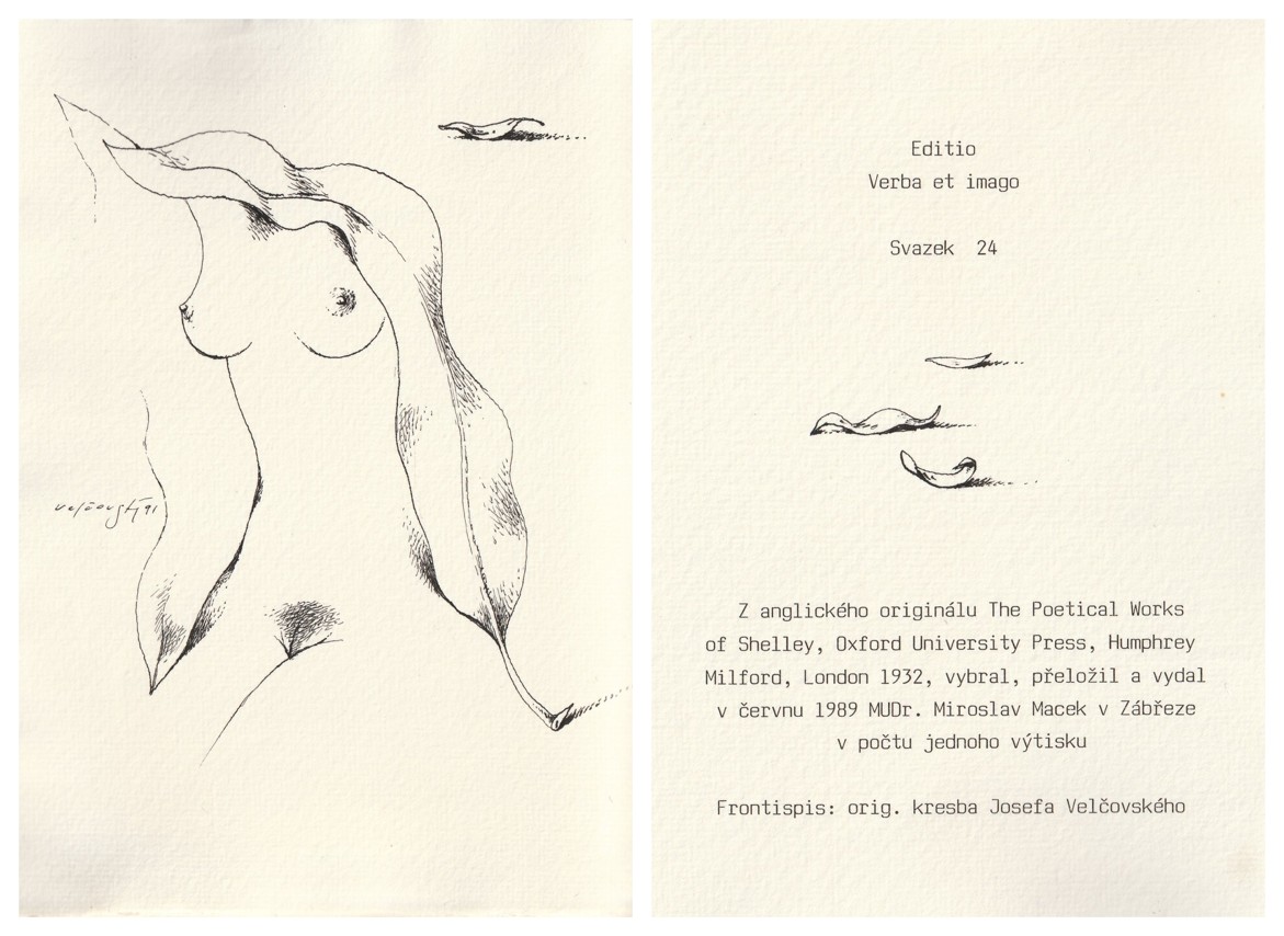 orig. kresba J. Velčovský ve frontispisu a tiráži, přeložil a vydal MUDr. Miroslav Macek v Zábřeze v počtu jednoho výtisku, 1989, šité archy v obálce, ruční papír, nestr., výborný stav
