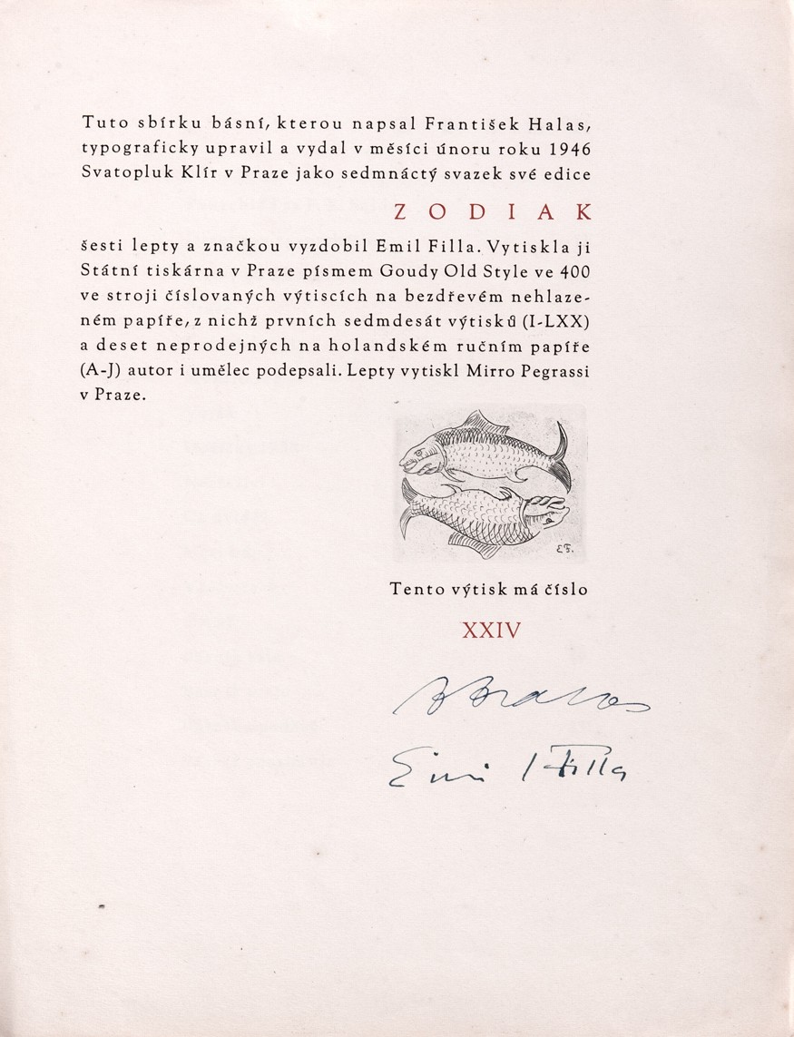 podpis E. Filla a F. Halas ve volné tiráži bibliofilie Torso naděje, tiráž obsahuje drobný autorův lept, volný list, dobrý stav