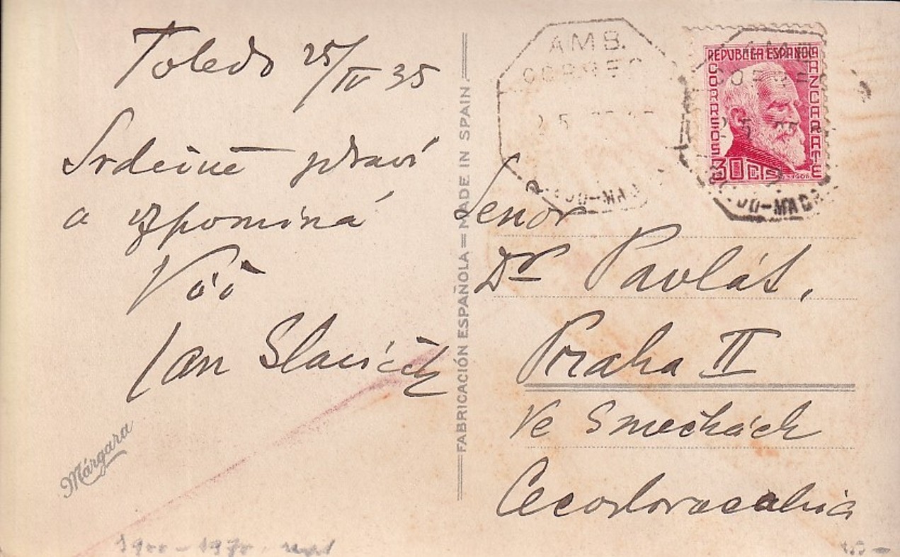 ručně psaný text a podpis na pohlednici, r. 1935, dobrý stav