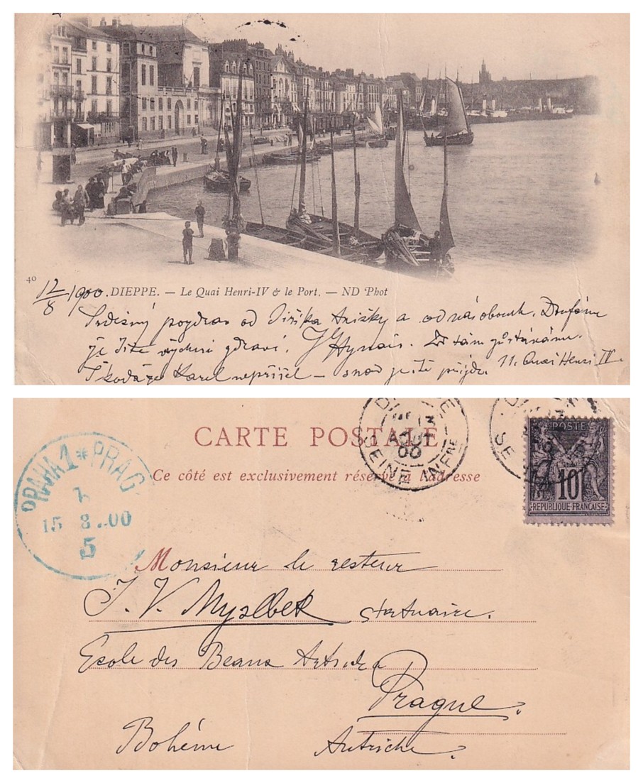 ručně psaný text a podpis na pohlednici, adresát J. V. Myslbek, r. 1900, dobrý stav