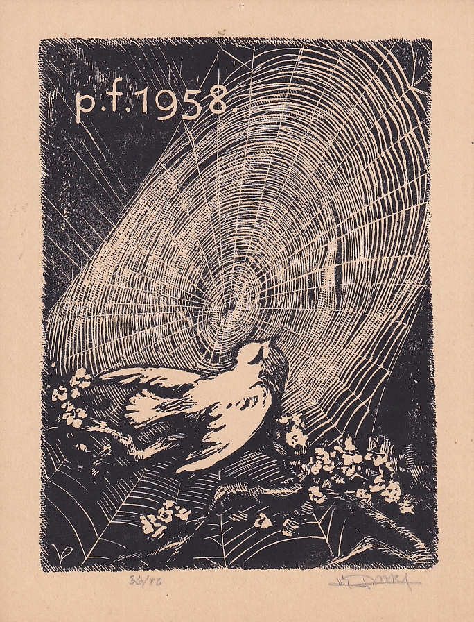 signatura vlevo dole Tichý 47, příloha katalogu vydaná v nákladu 100 výtisků k autorově výstavě ve Vilímkově galerii (31. I. - 18. II. 47), uvedeno v soupisu František Dvořák "František Tichý Grafické dílo" pod č. 139