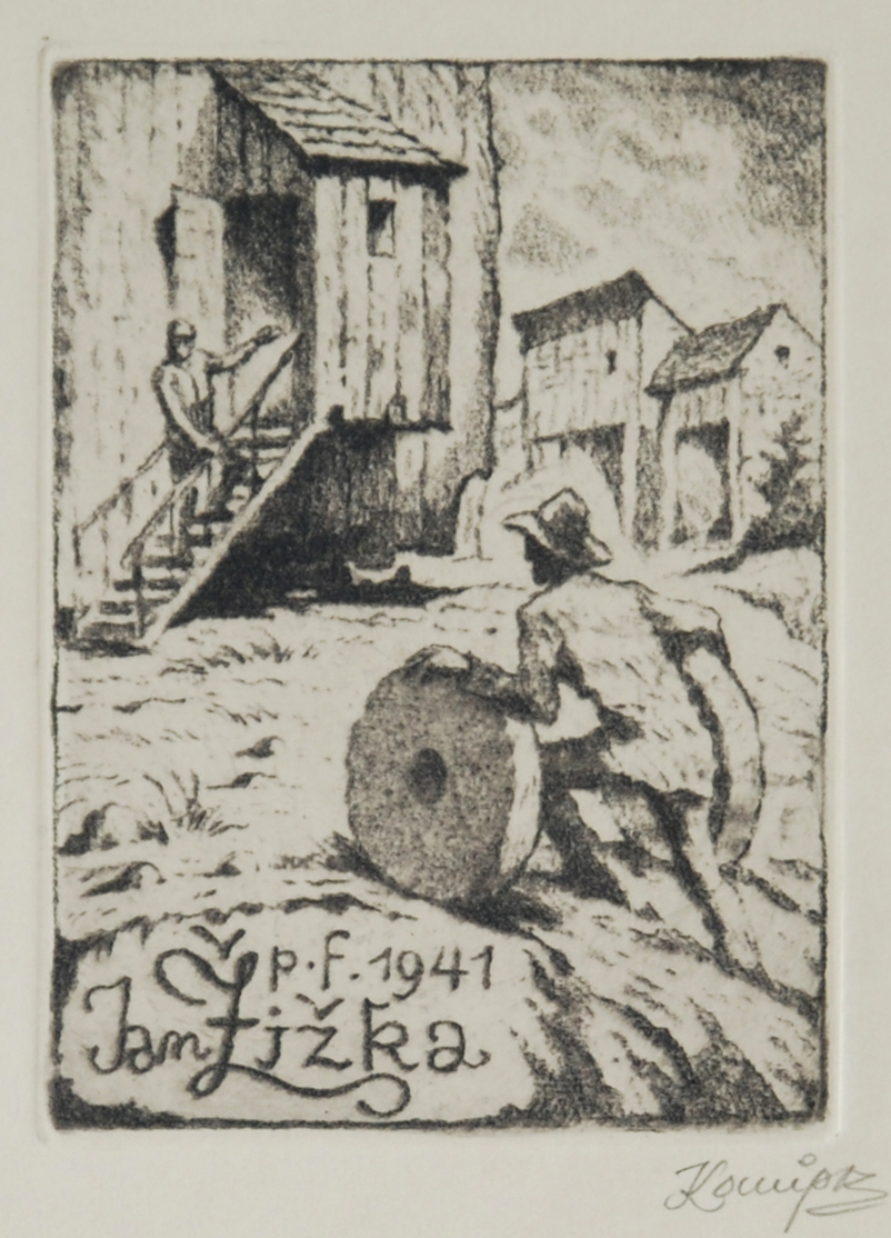 sign. PD Konůpek; na zadní straně: 93. p. f. Jan Žižka, vernis mou, 105 : 77. Mlynář valí vzhůru k dřevěnému mlýnu dva mlýnské kameny. LD 945. P. F. 1941 - Jan Žižka. Vernis mou 105 : 77. Mlynář se dvěma můýnskými kameny u větrného mlýna.Rok: 1941