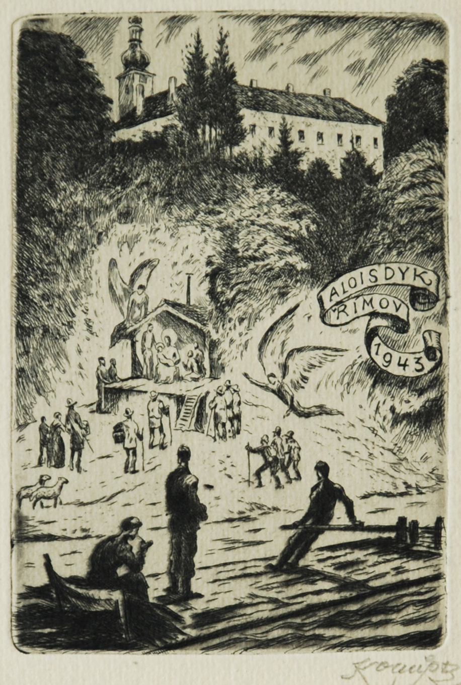 sign. PD Konůpek; na zadní straně: 119. Alois Dyk, Římov. 1943, lept 137 : 94, Narození Páně pod římovským zámkem LD 1072. Alois Dyk - Římov - 1943. Novoročenka. Lept 137 : 94. Narození Páně na břehu řeky před římovským zámkem.Rok: 1943