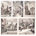 5x sign. ručně kolorovaná litografie V. Kubašta,  motivy Strahovského kláštera: čtyři různé pohledy na Strahovský klášter a interiér knihovny Strahovského kláštera, volné listy v původním kartonovém přebalu, výborný stav