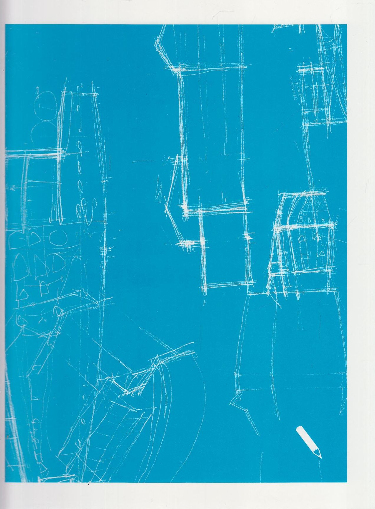 v kartonových deskách uložena kniha, skicář (62 stran) a stavební plán (A1, DVD)
